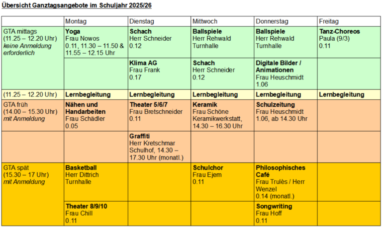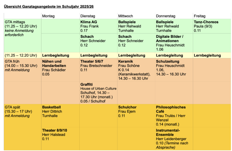 Am Donnerstag, den 18.09.25 startet das "Schnupperprogramm" der GTA-Angebote. Zwei Wochen kann man die Ganztagsangebote ausprobieren, muss sich dann aber verbindlich für das Jahr anmelden. Die Mittagsangebote können ohne vorherige Anmeldung besucht werden.