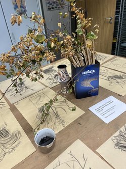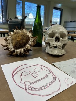 In Klasse 7 steht das Zeichnen im Vordergrund. In unterschiedlichen Techniken werden stille Leben zum Leben durch unterschiedliche Techniken geweckt.