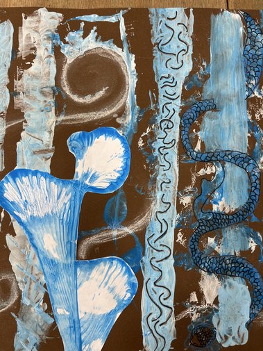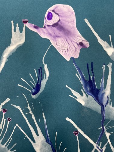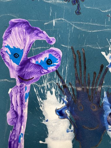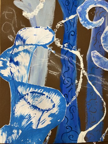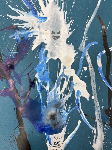 Klasse 6 - der Zufall in der Kunst - freie Formen finden durch die Technik der Fadengrafik, Frottagen und Action Painting. Durch die surrealen Collagen weht ein pastellfarbener Wind. In dieser zauberhaften Welt kam uns der Winter als Vorbild sehr entgegen. Die Eisblumen und Fantasiewesen geistern durch Köpfe und Bilder.