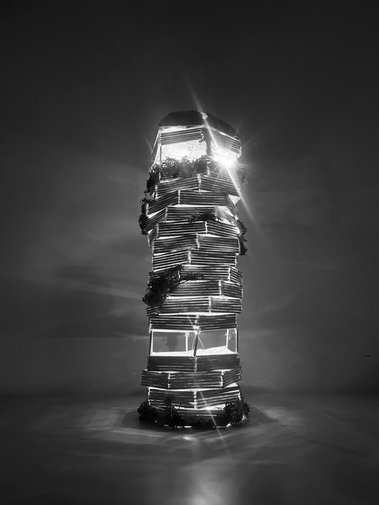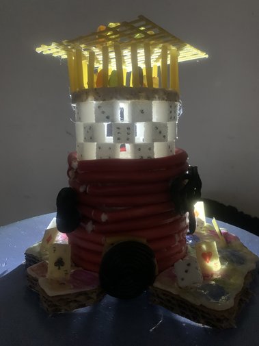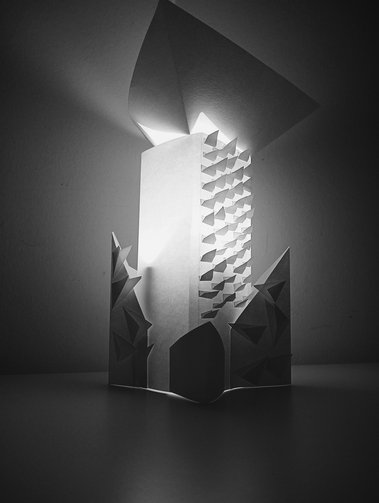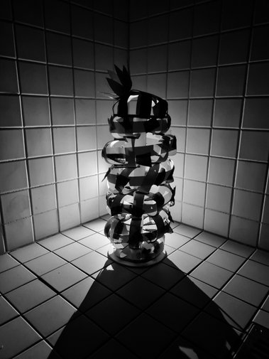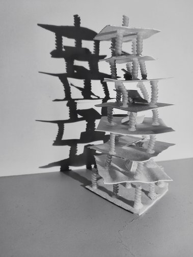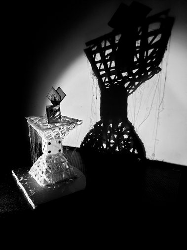Zwischen statischen und dynamschen Bauelementen suchen die Schüler Formen des Glücks. Verwendet werden weiße Papiere oder Süßigkeiten. Ausgangspunkt der künstlerischen Auseinandersetzung war der Turm zu Babel.