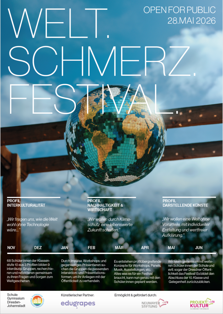 Im Profilunterricht 10 kann man erleben, wenn 65 Schülerinnen und Schüler einer Klassenstufe interdisziplinär zusammenarbeiten und sich gegenseitig die in den drei Profilen entstandenen Inhalte vorstellen. Gemeinsam sollen für ein Festival am 28.Mai 2026 im Objekt Klein A unterschiedliche Formate zu Inhalten der Profile erarbeitet und präsentiert werden. Die Themen der Profile wie zum Beispiel Nationalstaatlichkeit, Heimaten und die Inszenierung "Die Verwandlung" treffen aufeinander und werden weitergeführt. Unter Anleitung und in Kooperation mit Edugrapes Leipzig werden selbstorganisiert Formate für das Festival erarbeitet. Gefördert wird das Projekt von der Neumayer Stiftung.